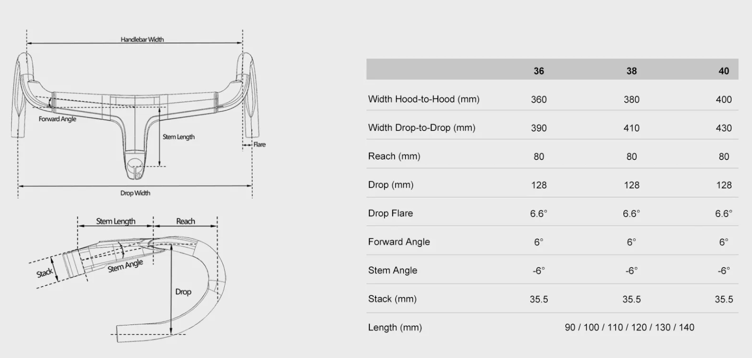 Available in 18 sizes with widths ranging from 360 mm to 400 mm and stem lengths from 90 mm to 140 mm.