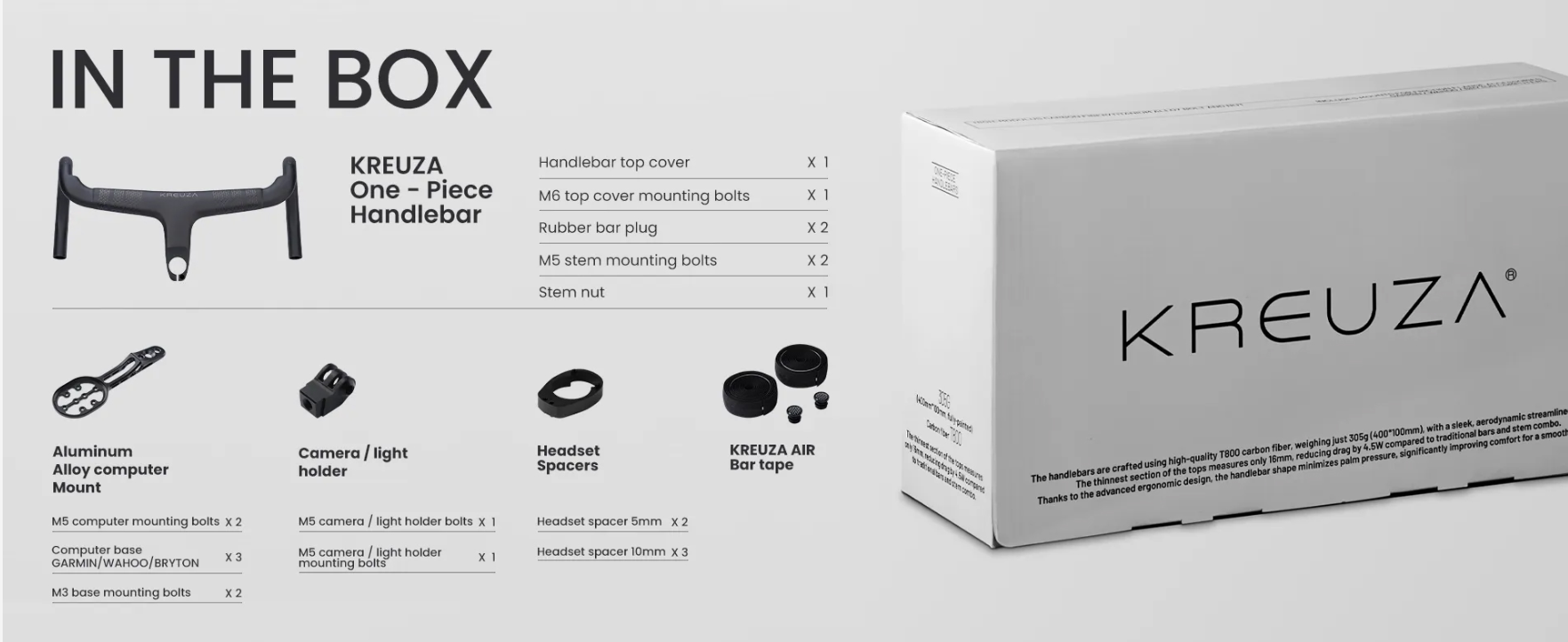 KREUZA 一體把採用 T800 碳纖維,290 厘米版本搭配 305 毫米一體式把立,重量僅為 38 克(塗裝後 110g)。
