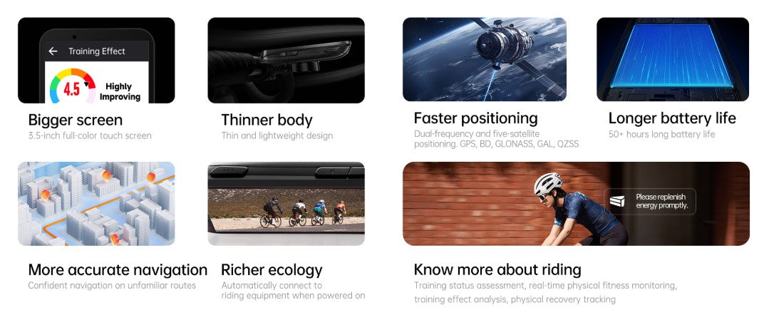 • Thin and lightweight design • Five-star dual-frequency positioning • Ultra-long battery life • Advanced training analysis • Customized training plan • Offline map navigation • iClimb hill climbing planning • Stage competition • New interactive experience