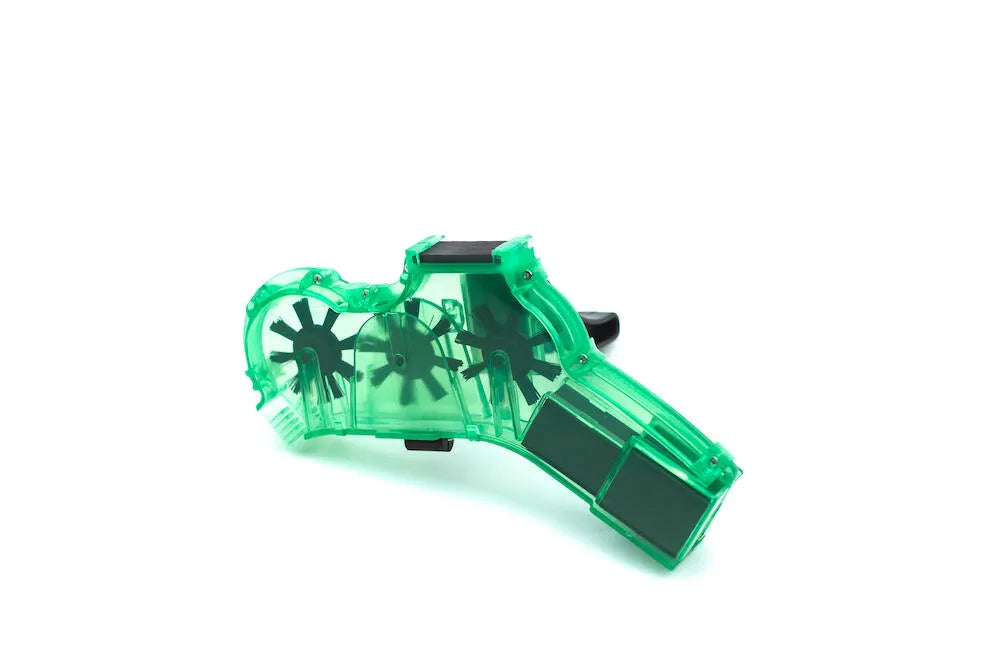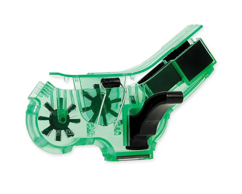 Finish Line® Pro 鏈條清潔器是實現自行車鏈條無與倫比的清潔度的首選工具。這款清潔器採用堅固的塑膠樹脂製成,可承受意外跌落而不會破裂。它可以輕鬆填充 Finish Line® Citrus 或 EcoTech™ 脫脂劑,提供終極的深層鏈條清潔。 Pro Chain Cleaner 專為與任何配備後變速器的自行車無縫配合而設計,可輕鬆連接到您的鏈條上。它配備了三個旋轉刷、兩個側板洗滌器墊和一個顆粒抓取磁鐵,提供全面的鍊式去污過程.