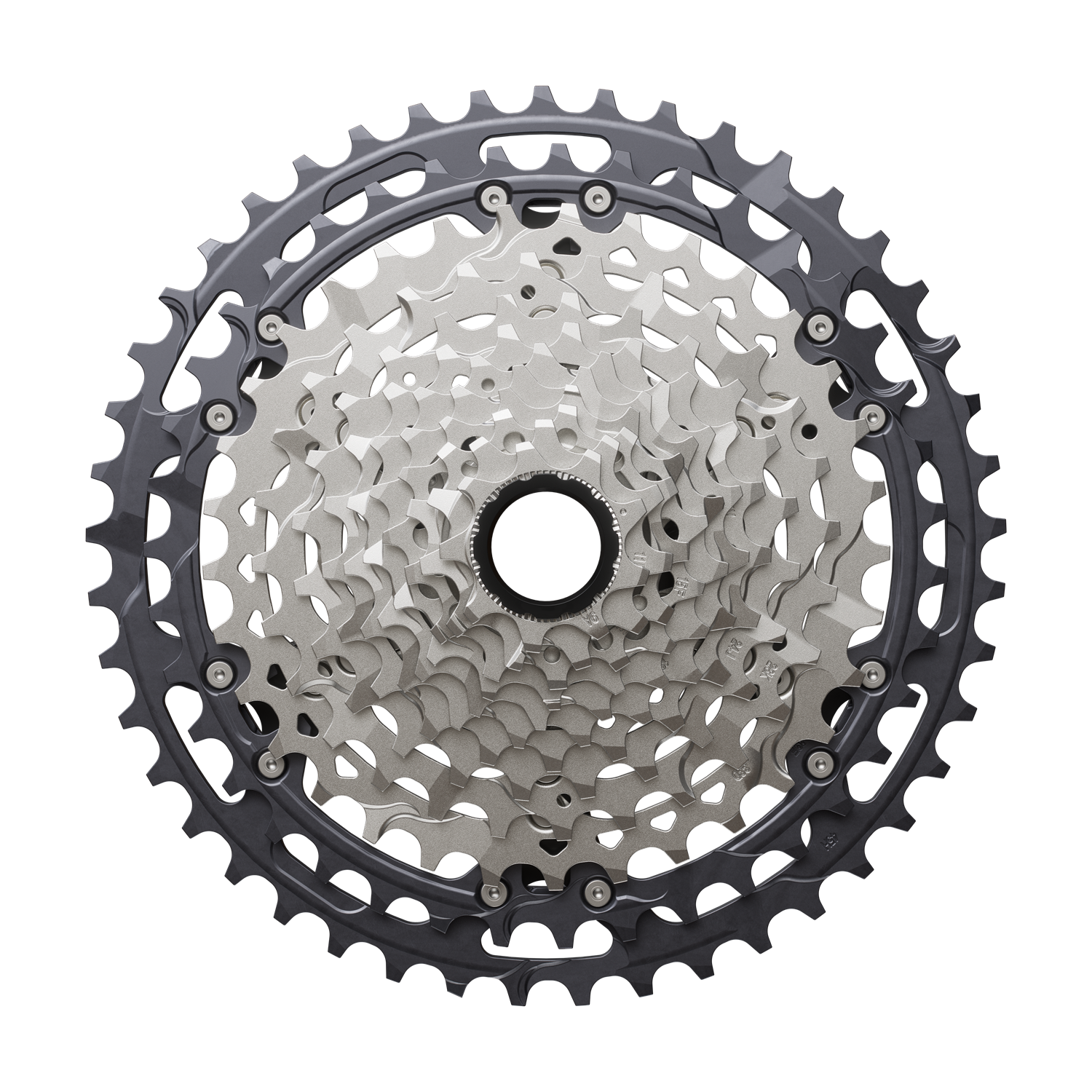 9-45T 輕巧傳動系統:搭配較小齒盤及 GS 規格 DEORE XT 後變速器,9-45T DEORE XT 卡式飛輪提供輕量化、高離地間隙的選擇,同時保有完整的 500% 齒比範圍。